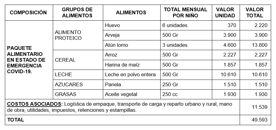 La Secretaría de Educación de manera inmediata adelantó las gestiones tendientes a iniciar un estudio de costos y de mercado antes mencionado que permitió conocer los precios de todos los productos y la disponibilidad de los mismo. De las tres modalidades establecidas en las resoluciones antes mencionadas, la Secretaría eligió la Ración para Preparar en Casa (RPC) la cual se compone de los siguientes productos: