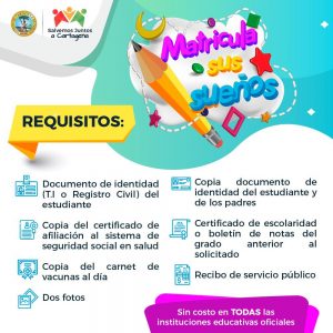 Cartagena de Indias, D. T. y C., 19 de enero de 2020.– Que ningún niño, niña o adolescente se quede sin ir a la escuela. Esa es la meta en la que trabaja el Gobierno Distrital a través de la Secretaría de Educación, con la campaña Matrícula Sus Sueños, en el que se invita a papás, mamás, tíos, abuelos y demás familiares que estén al cuidado de los menores, a formalizar el proceso de matrícula en las instituciones educativas oficiales del Distrito.